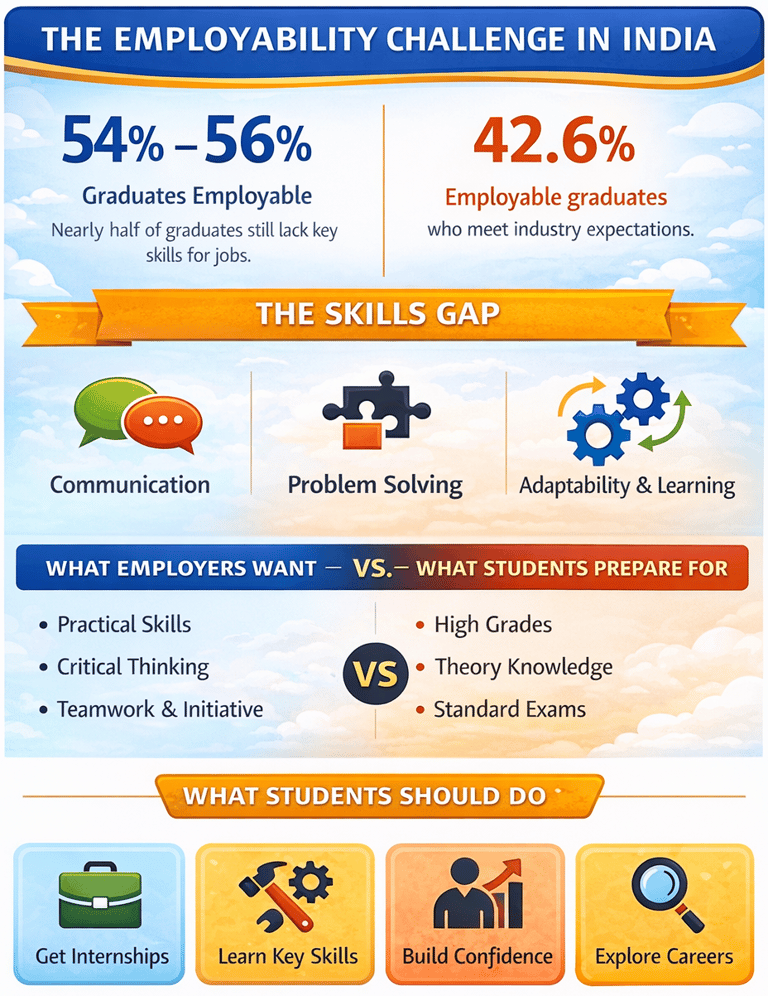 India’s employability data shows clear progress, but also a strong message: certificates alone won’t secure your career. The world of work is moving toward a skills-first economy, and freshers who adapt early have an edge.